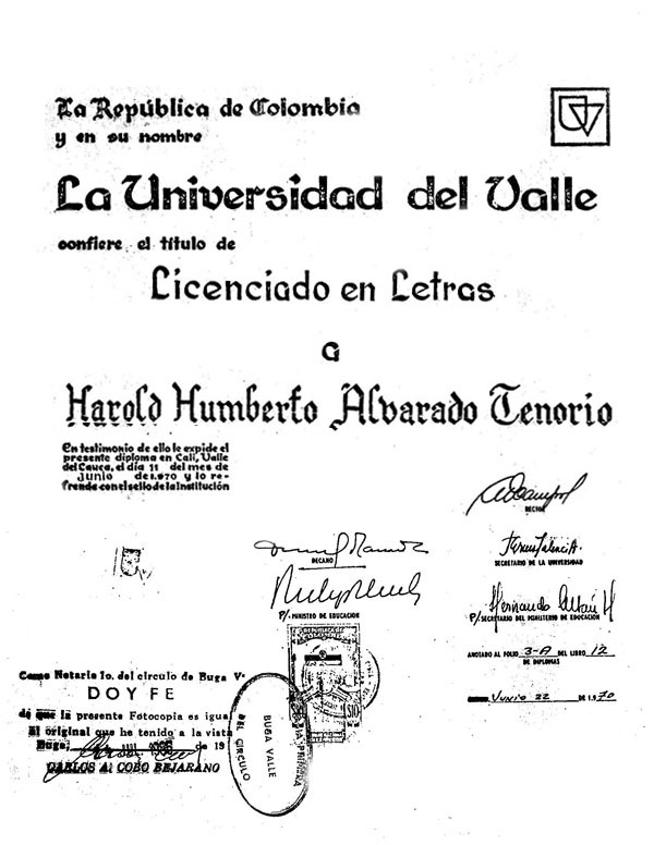 1971 El Ministerio de Educación y Ciencia de España convalida [5 de Junio] su título de Licenciado en Letras de la Universidad del Valle como Licenciado en Filosofía y Letras, sección de Filología Románica de la Universidad Española.